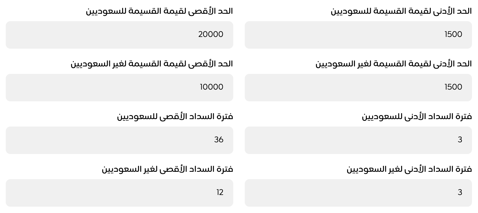 - لاستخدام تابي للدفع يجب أن يكون الحد الأدنى لقيمة الفاتورة والحد الأقصى لها وفترة السداد سواءً للسعودي وغير السعودي وفقاً للجدول التالي: